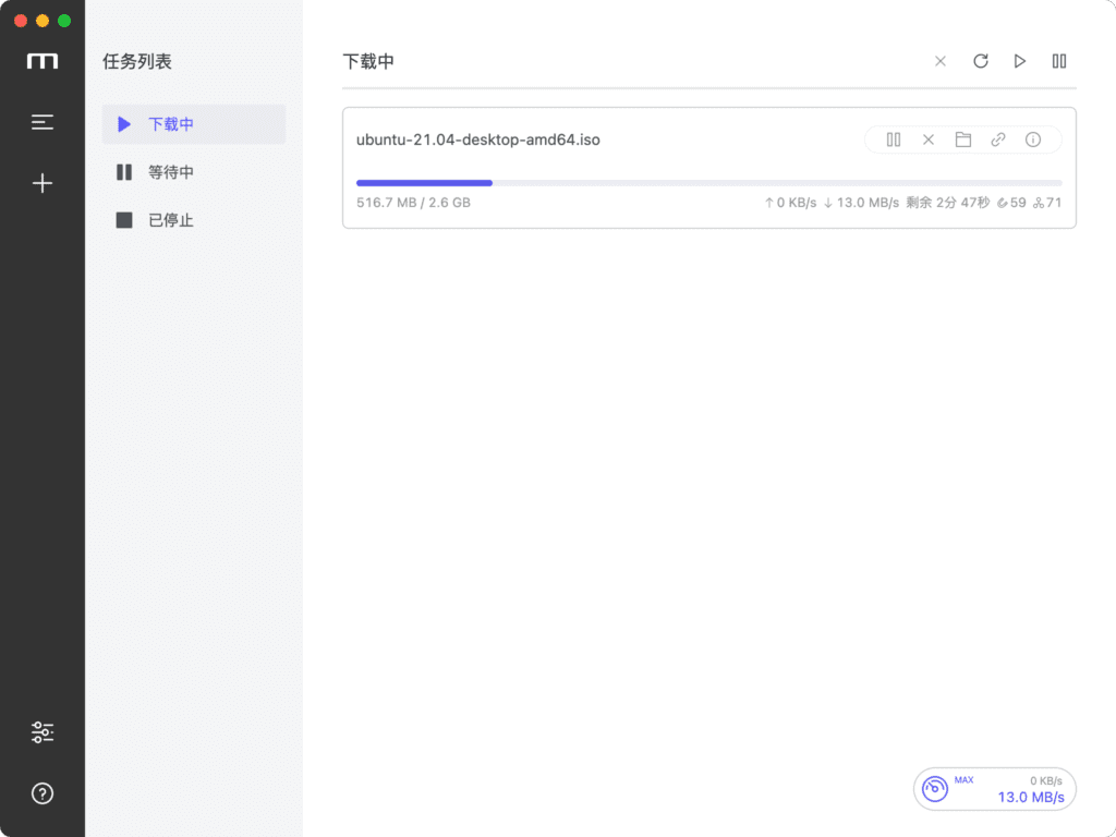 ,motrix是一个功能强大且易于使用的跨平台下载管理工具,它简洁的界面设计和人性化的交互,使下载任务管理变得简单方便。如果你需要一个可靠高效的下载工具,motrix是个不错的选择。 特性 简洁明了的图形操作界面 支持BT和磁力链任务 支持选择性下载BT部分文件 每天自动更新 Tracker 服务器列表 UPnP & NAT-PMP 端口映射 最高支持 10 个任务同时下载 单任务最高支持 64 线程下载 下载进度图形动态显示 模拟用户代理UA 下载完成后通知 支持触控栏快捷键(Mac 专享) 常驻系统托盘,操作更加便捷 深色模式 移除任务时可同时删除相关文件 国际化, 查看已可支持的语言 更多特性开发中 Download